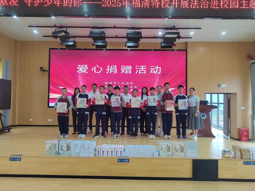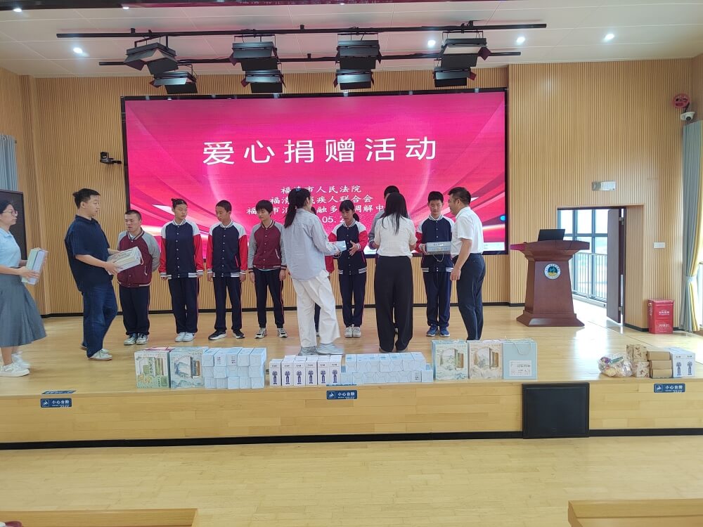 讲座结束后,福清市汇信金融多元调解中心与福清市人民法院、福清市残疾人联合会共同进行了爱心捐赠,为孩子们送上了《中华人民共和国民法典》书籍及“情暖六一”礼物,让孩子们在感受法治温暖的同时,也体会到社会的关爱与支持。