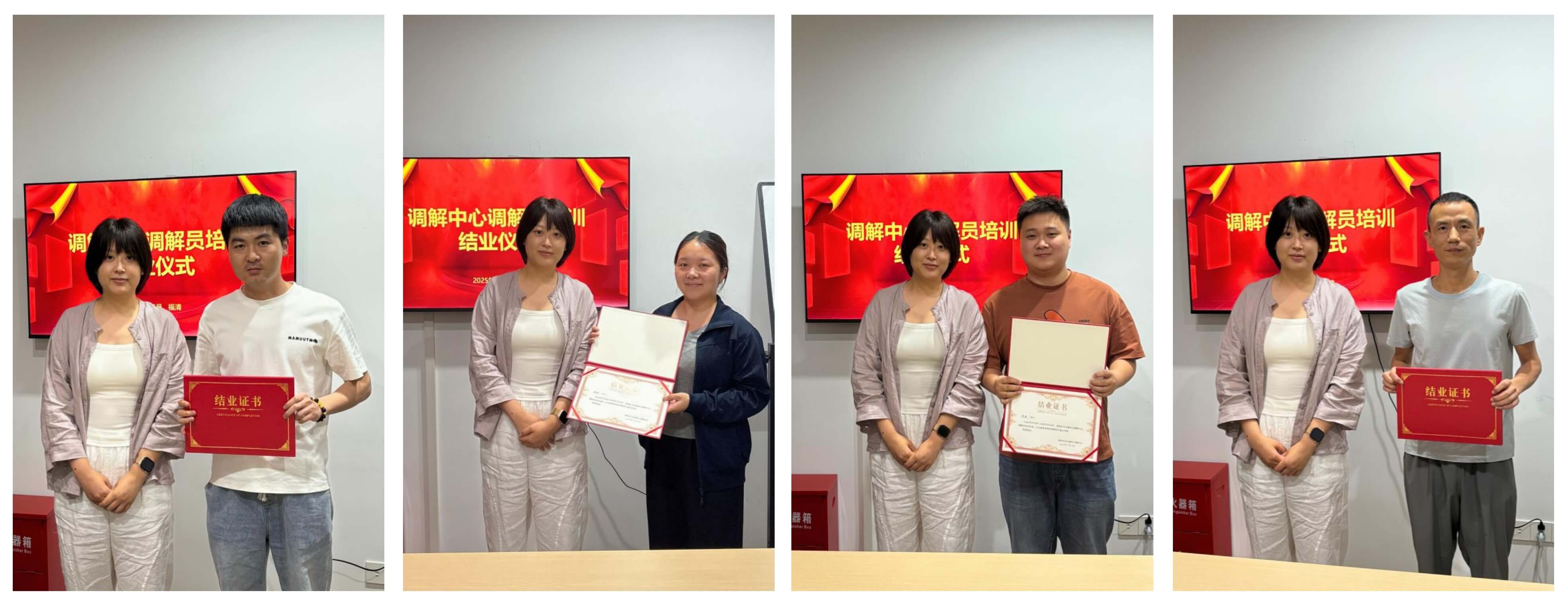 经严格考核,四位学员均以优异成绩通过最终考试,顺利获得由中心颁发的金融调解专业结业证书,正式成为汇信调解团队的新生力量。